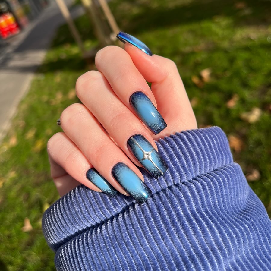 Ще один варіант у блакитному відтінку – манікюр із аурою. Його ще називають, аura nails, airbrush, такий нейл-арт став популярним у соцмережах TikTok та Instagram приблизно рік тому. На нігтях роблять малюнок у вигляді яскравих кіл з плавним переходом кольору (омбре, градієнт), що нагадує м'яке сяйво аури людини. Цей дизайн наповнений глибоким змістом і виглядає дуже стильно та загадково.