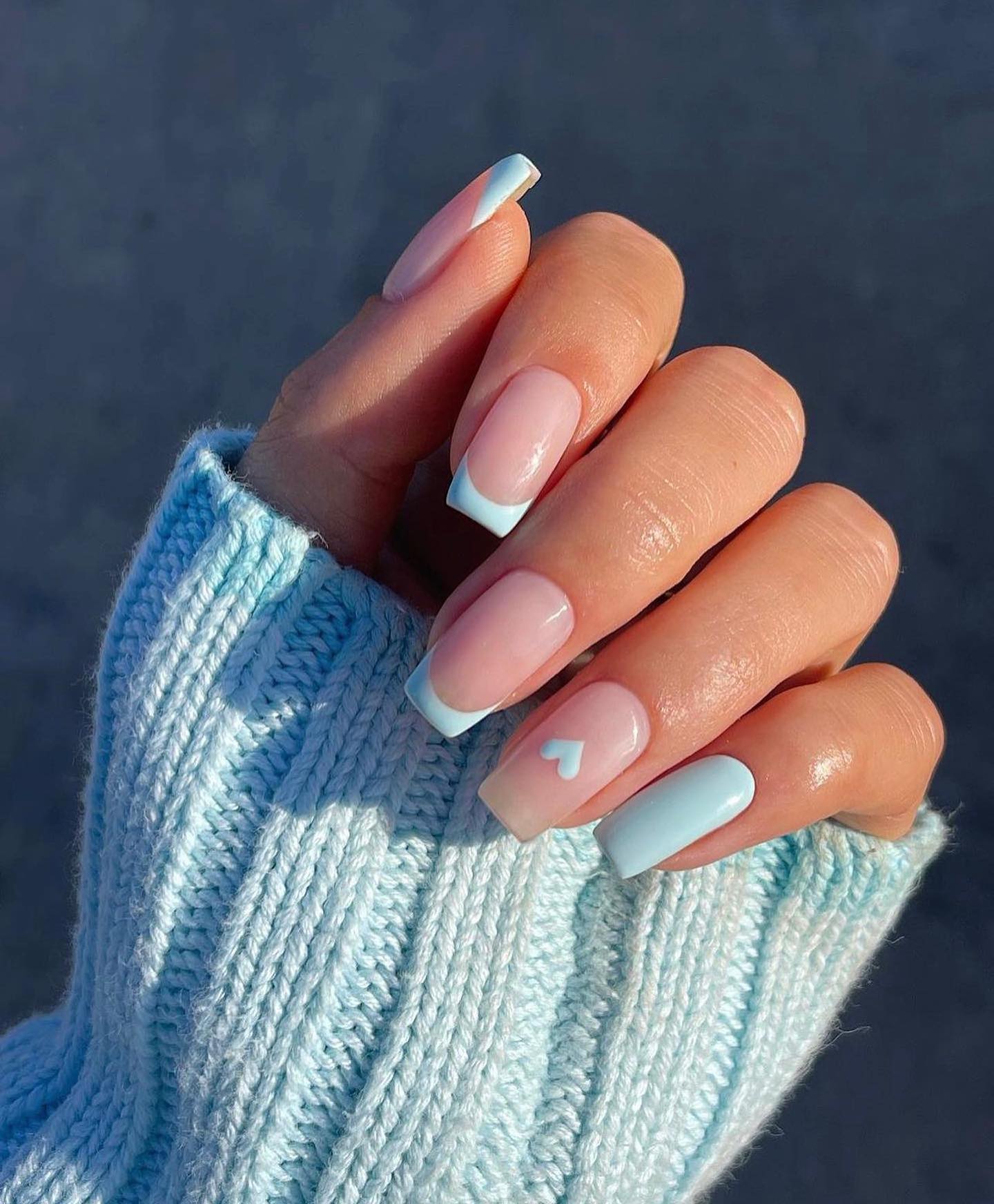 Френч – безпрограшний варіант для нігтів будь-якої довжини та форми. Як відомо, класичний французький манікюр створюють так: нігтьову пластину покривають неяскравим бежевим або пастельно-рожевим тоном лаку, а на кінчик нігтя за формою півмісяця наносять білий колір. Якщо ви любите виділятися з натовпу, прикрасьте його блакитним кінчиком.