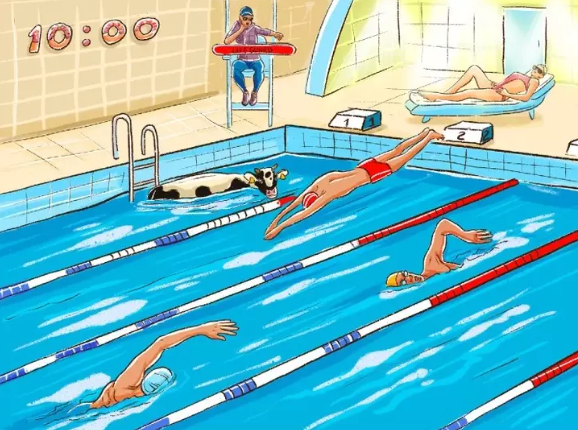 На зображенні видно басейн, наповнений плавцями, які, на перший погляд, беруть участь у місцевих змаганнях. На картинці багато яскравих деталей в динаміці, але хай вас не обманюють кольори і експресія.