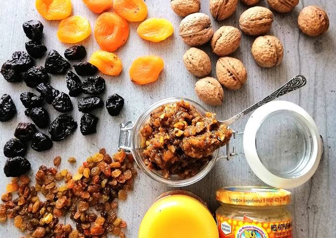 Інгредієнти: натуральний мед (250 г), курага (250 г), родзинки (250 г), сушений чорнослив (250 г), інжир (250 г), волоські горіхи (1 склянка), лимон (1 шт.).
