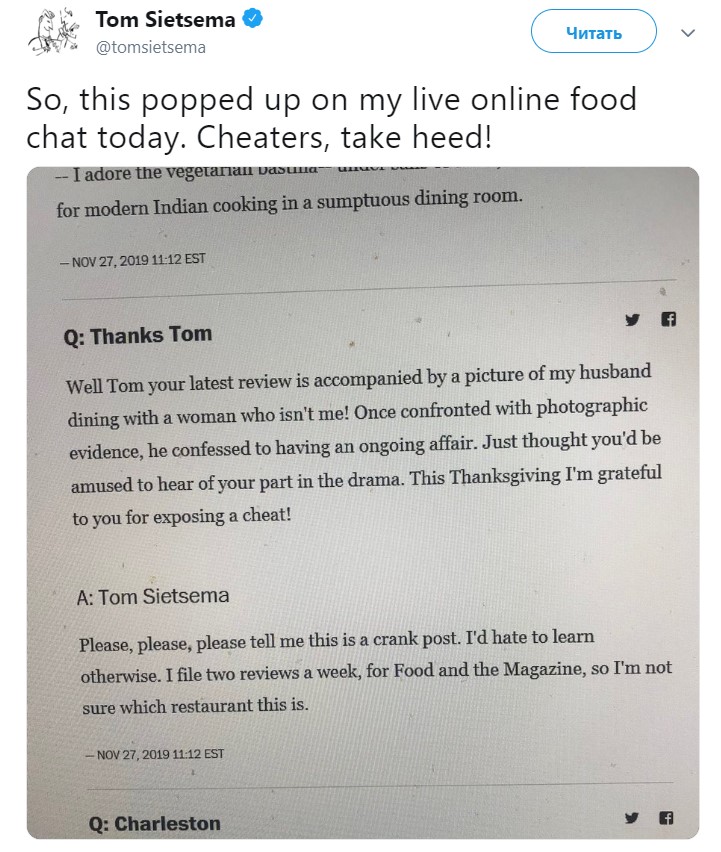 "Дякую, Томе. Ваша остання рецензія супроводжується фотографією мого чоловіка, який обідає з жінкою, яка точно не я! Побачивши доказ, він зізнався, що завів роман на стороні. Подумала, вам буде цікаво дізнатися про вашу роль в нашій драмі. У цей день подяки я дякую вам за те, що ви допомогли мені викрити зрадника", - написала журналісту жінка.