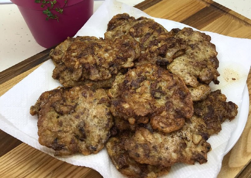 Сковороду добре розігріваємо з олією. Викладаємо ложкою печінкову масу, формуючи невеликі млинці. Обсмажуємо спочатку з одного боку, потім перевертаємо на другий. Перекладаємо готові оладки на паперові рушники, щоб увібрався зайвий жир.