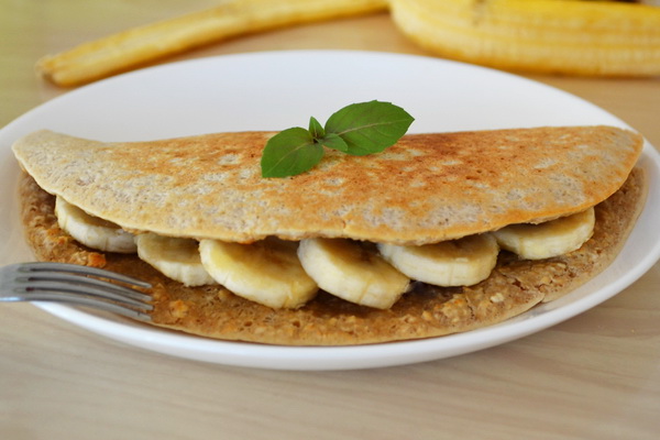 Готовий млинець із вівсяних пластівців викладаємо на тарілку. На одну половину викладаємо нарізані банани та накриваємо другою. Також можна полити його медом або подати із варенням.