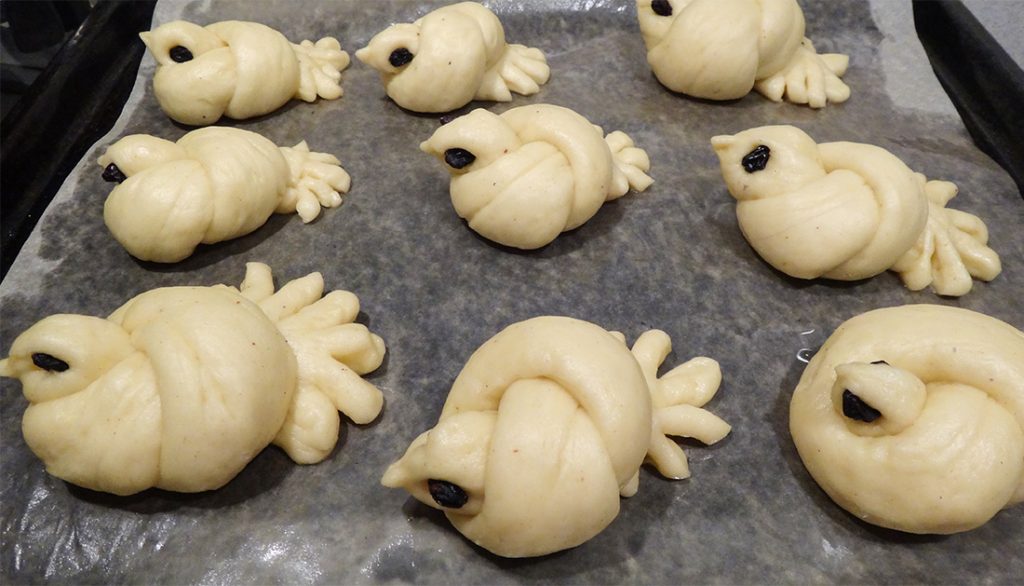 1. З тіста робимо ковбаску завтовшки приблизно з великий палець і нарізаємо її на невеликі однакові шматки. Не варто робити їх занадто маленькими, інакше важко згортати вузлики. З такої кількості тіста виходить 6 джгутів. Кожен джгутик зав'язуємо вузликом, з одного кінця формуємо голівку з дзьобиком, а з іншого – широкий плоский хвостик. Зробимо на хвостику кілька надрізів ножем, щоб вийшли пір'їнки. Там, де мають бути очі, вставляємо шматочки родзинок.