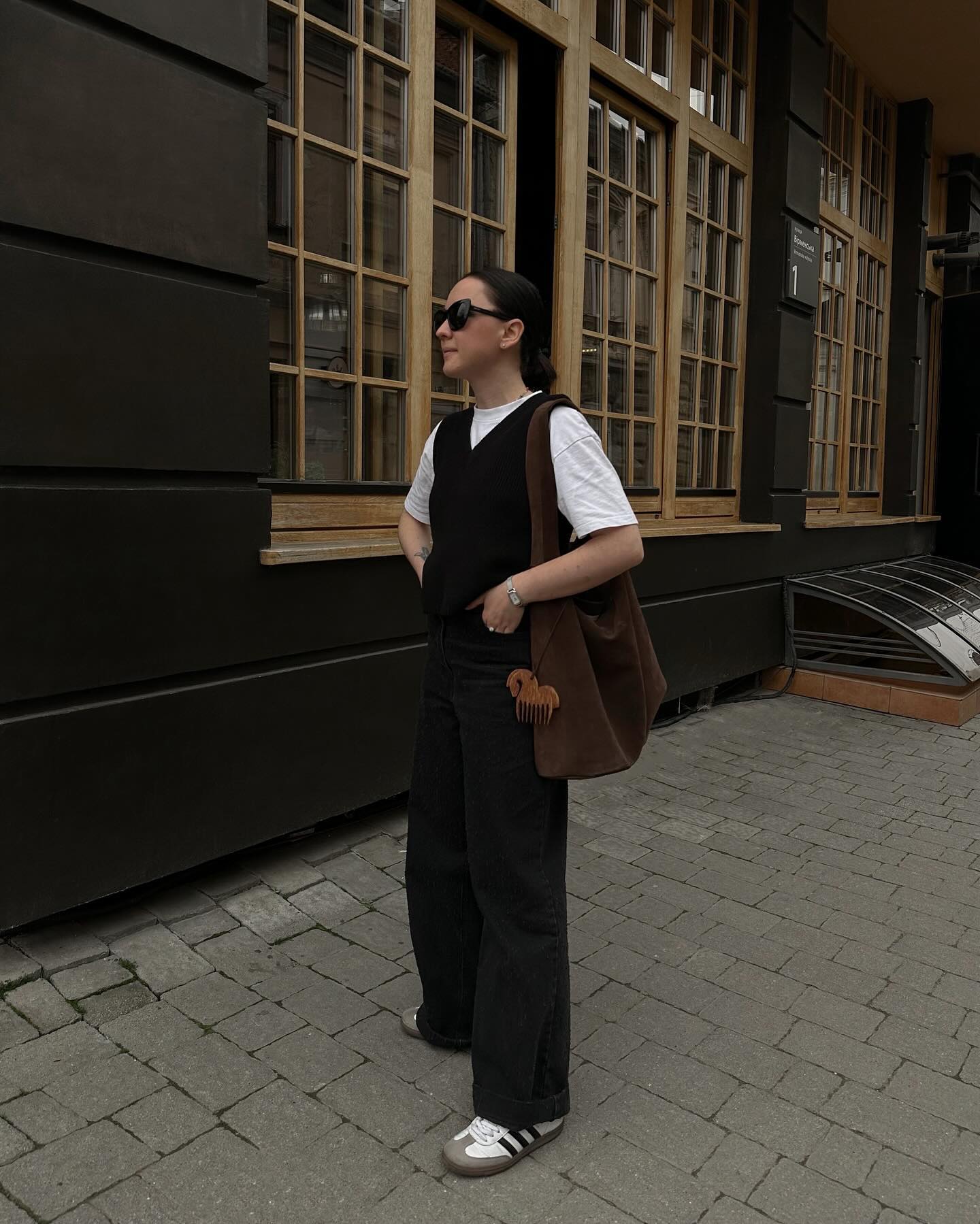 Перший варіант, як носить такий жилет навесні, – з футболками. Придивіться актуальну модель джинсів, яку можна доповнити білою футболкою оверсайз та сірим жилетом, а доповнять лук трендові кеди.