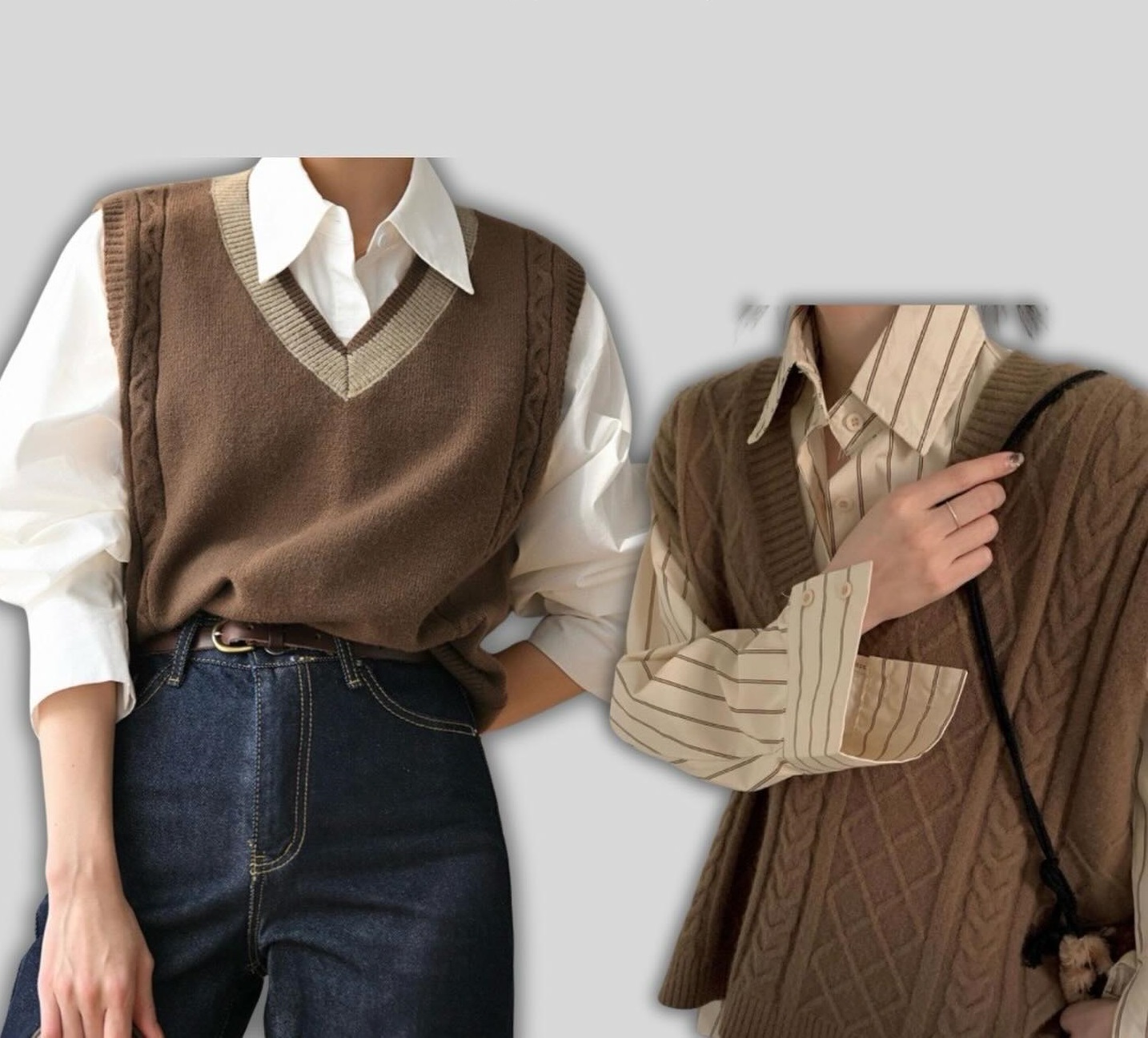 Якщо хочете отримати більш стильний образ, вибирайте коричневі трикотажні жилети оверсайз - їх ще називають "у стилі діда" (створюється враження, що таку річ взяли з гардероба родича старшого покоління). Їх можна поєднувати як із діловими костюмами, так і з джинсами та спідницями у кежуал-образах.