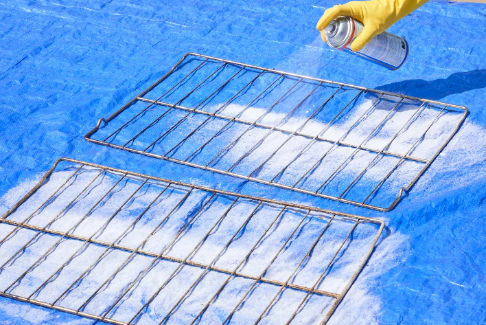 Одягніть гумові рукавички та рясно розпиліть засіб для чищення духовки на решітки. Дайте постояти приблизно 10 хвилин.