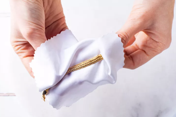 Уникайте агресивних хімічних речовин, таких як відбілювач або зубна паста, оскільки вони позбавляють сплави золота. Ніколи не використовуйте грубі аплікатори, такі як паперові рушники або щітки з металевою щетиною, для чищення золотих прикрас, щоб запобігти подряпинам.