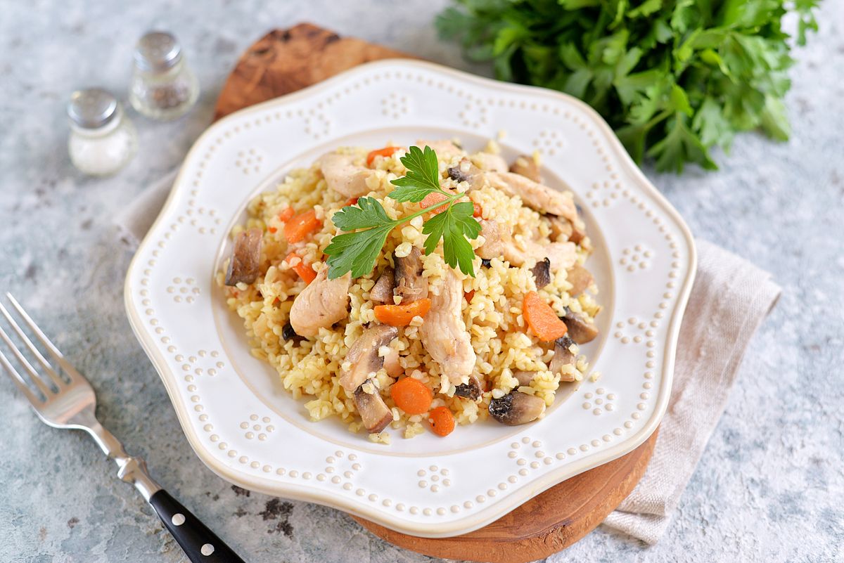 Подаємо булгур з м'ясом та грибами до столу на обід чи вечерю.