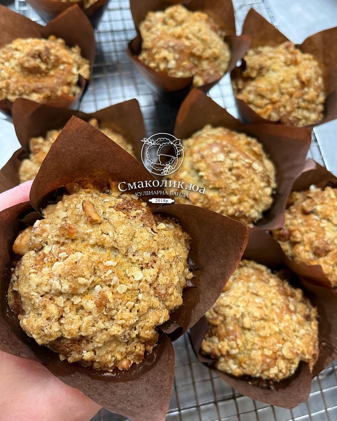 Приготуйте топінг. З'єднайте борошно, цукор, вівсянку та подрібнені горіхи. Потім візьміть холодне вершкове масло і руками перетріть із сипучими інгредієнтами. Посипте топінгом кекси і відправляйте в духовку. Випікайте при температурі 190 градусів 20-25 хвилин.