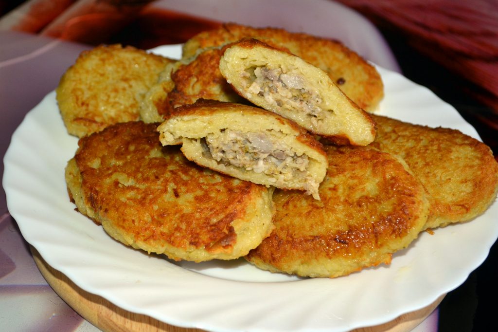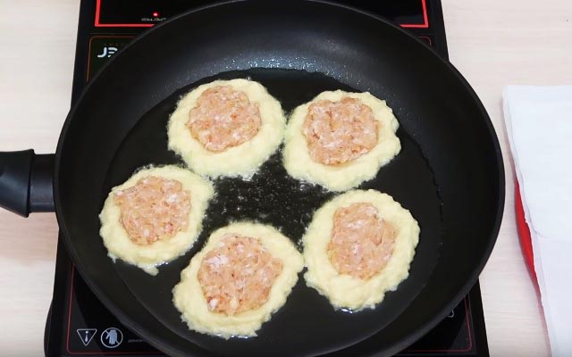 Розігріваємо сковороду з рослинною олією. Столовою ложкою викладаємо картопляний фарш, на нього курячий і зверху знову картопляний фарш. Смажимо спочатку з одного боку до золотавої скоринки, а потім перевертаємо на інший.