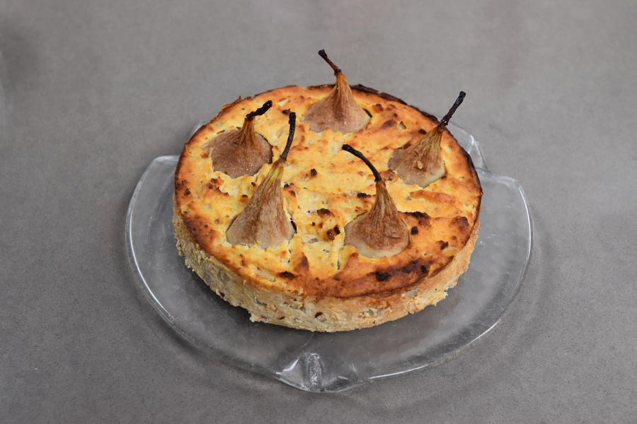 Перемістіть суміш до форми (бажано не менше 20 см в діаметрі) та додайте верхівки груш з хвостиком. Добре утрамбуйте, щоб підрівняти запіканку. Перед відправкою до духовки, оберніть запіканку фольгою та зніміть за 15-20 хвилин до кінця випікання. Так груші встигнуть добре пропектися.