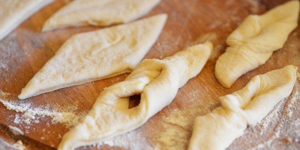 Розкочуємо тісто в пласт завтовшки до 1 см і розрізаємо на ромби, у середині кожного ромба робимо надріз. Один край тіста вивертаємо через надріз так, як зазвичай на хмиз.