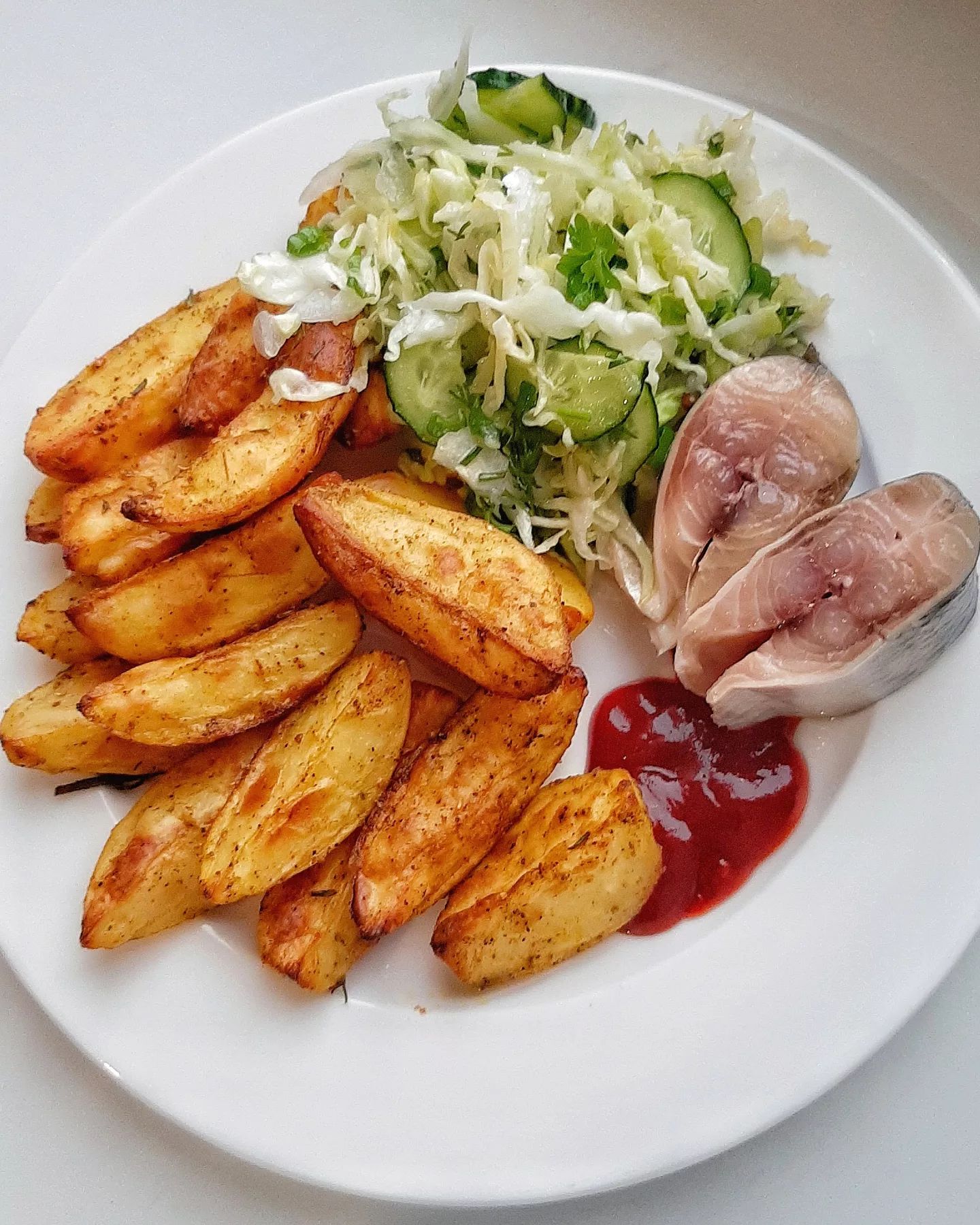 Інгредієнти: картопля (1 кг), сіль (0,5 ч. л.), перець (0,3 ч. л.), солодка паприка (1 ч. л.), сушений часник (0,5 ч. л.), кукурудзяний крохмаль (1 ст. л.), олія (2 ст. л.).