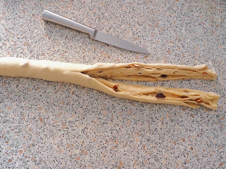 Тісто, що підійшло, сформуйте у прямокутник приблизно 30х40 см, змастіть м'яким вершковим маслом, посипте сухофруктами, попередньо замоченими та обсушеними, і мигдальними слайсами. Заверніть у рулет по довгій стороні прямокутника. Розріжте його поперек на потрібну кількість відрізків (на 2 або 3 крафіни). Потім кожний рулетик розріжте вздовж, не дорізаючи до кінця 4-5 см.