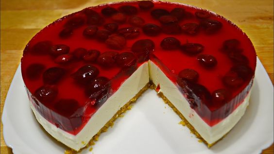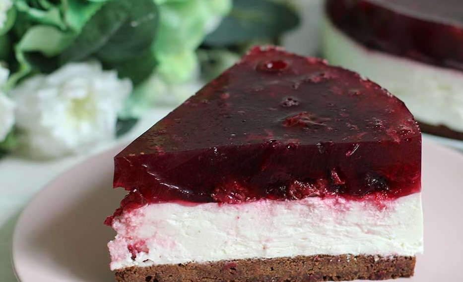Дістаємо з холодильника основу із застиглим сирним мусом, викладаємо на неї вишню і заливаємо желе. Ставимо назад у холод мінімум на 3-4 години або на всю ніч.
