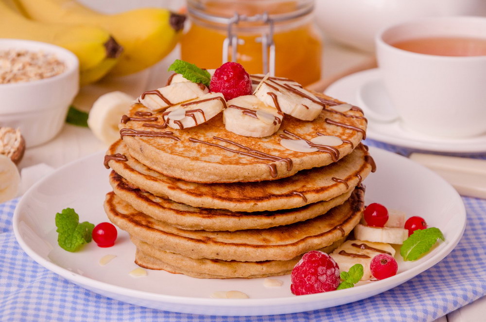 Подаємо до столу апетитні вівсяні панкейки з фруктами, медом, джемом або згущеним молоком.