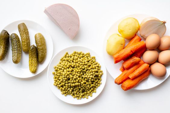 Інгредієнти: куряче м'ясо (або варена ковбаса), картопля, морква, яйця, мариновані огірки, консервований зелений горошок, зелена цибуля, майонез, сіль.