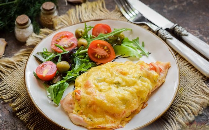 Також можна поекспериментувати та приготувати їх у духовці. Викладаємо підготовлені шматочки сирого філе на деко, застелене пергаментом. Змащуємо майонезом, додаємо за бажанням скибочки помідора, а зверху посипаємо натертим сиром. Запікаємо при температурі 180°С близько 35-40 хвилин.