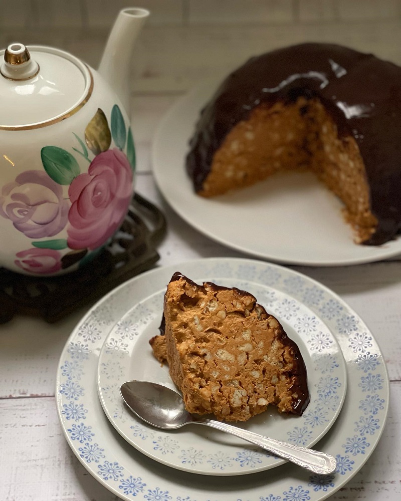 Вистилаємо харчовою плівкою в декілька шарів ємність для торта, викладаємо в неї поступово суміш, періодично утрамбовуючи її, щоб не було повітряних порожнин. Зверху накриваємо харчовою плівкою в контакт і відправляємо холодильник на 8-10 годин.
