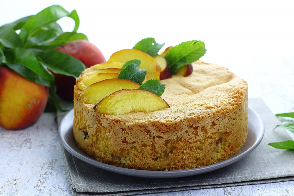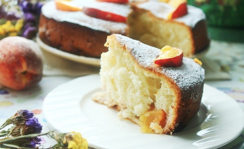 Інгредієнти: персики (4-6 шт.), борошно (1 склянка), цукор (1 ст.), яйця (4 шт.), розпушувач для тіста (1 ч. л.), цукрова пудра (для посипки).