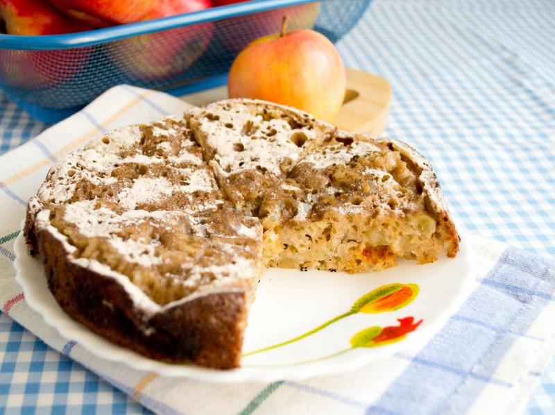 Інгредієнти: цукор (120 г), борошно (80 г), вершкове масло (30 г), яйця (3 шт.), яблука (2 шт.), рослинна олія (1 ст. л.), розпушувач (0,5 ч. л.).