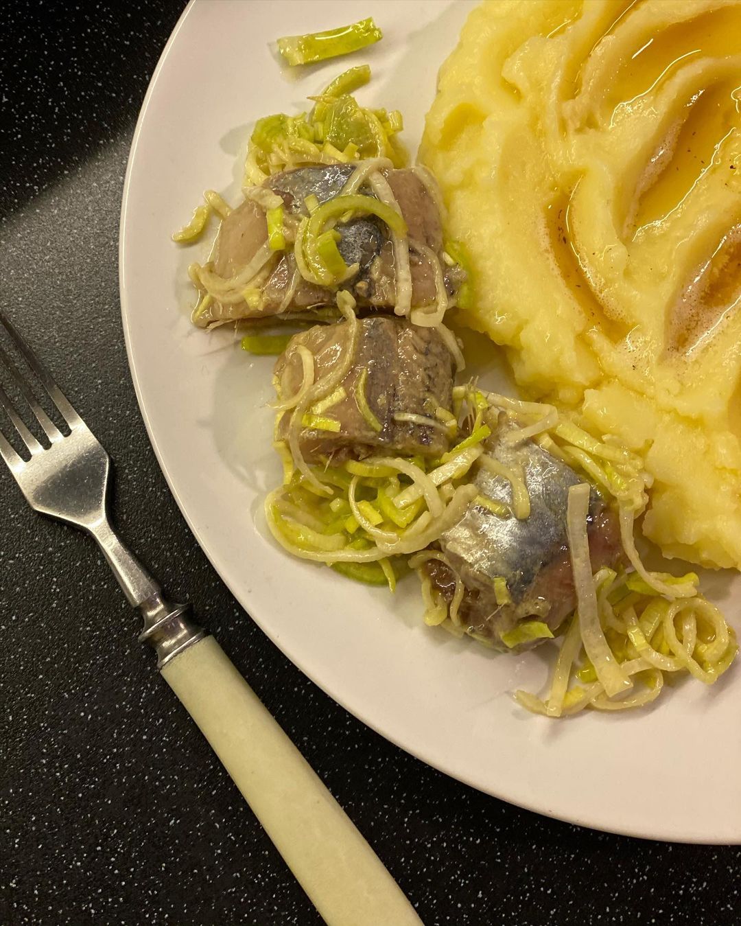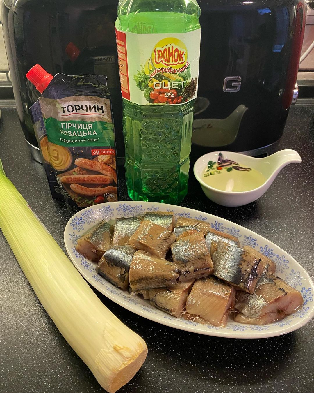 Інгредієнти: слабосолоний оселедець (1 кг), цибуля-порей (1 шт.), гірчиця (9 ч. л.), рослинна олія (150 мл), оцет (3 ч. л.).