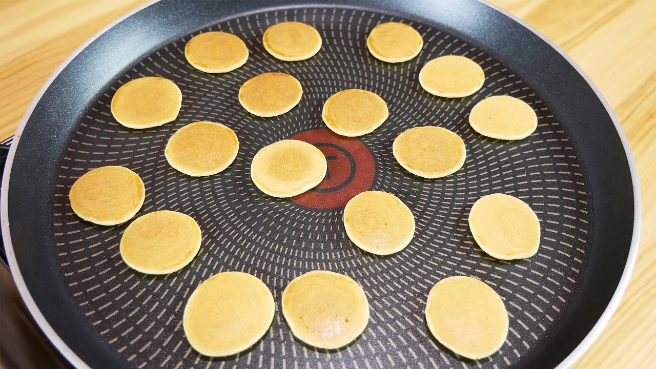 Подаємо апетитні міні-панкейки до столу з медом, згущеним молоком, сметаною або ягодами.