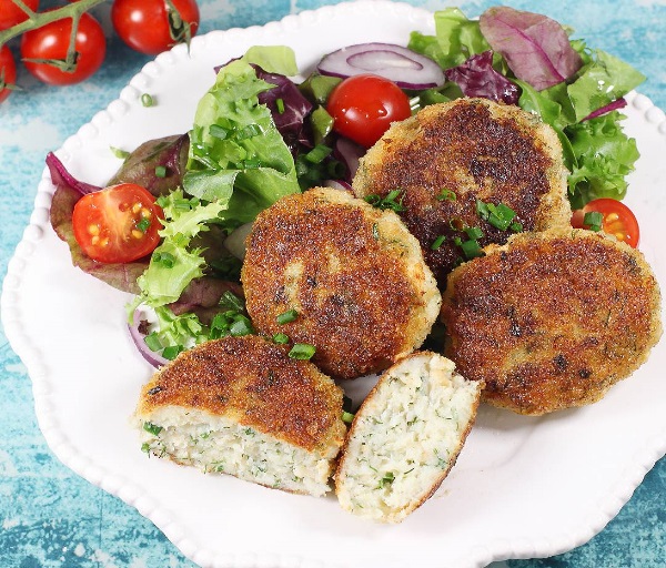 Інгредієнти: філе тріски, минтая або палтуса (300 г), картопля (300 г), яйця (3 шт.), цибуля (1 шт.), оливкова олія (1 ст. л.), панірувальні сухарі, сіль, перець.