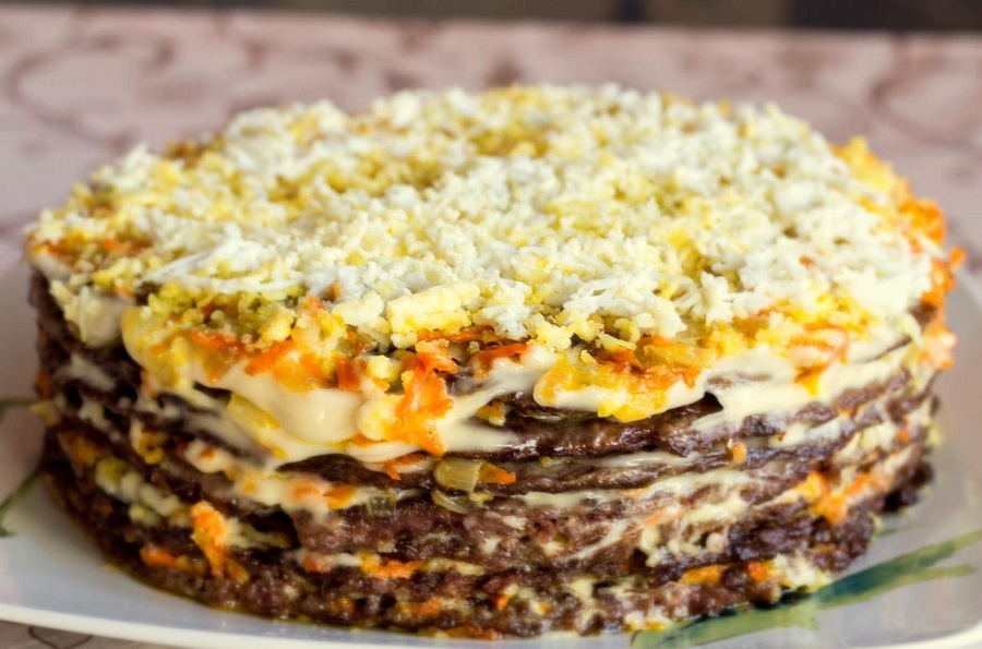 Збираємо печінковий торт з морквою: викладаємо перший млинець, потім начинку, знову млинець, начинка тощо. З даних інгредієнтів має вийти два торти.