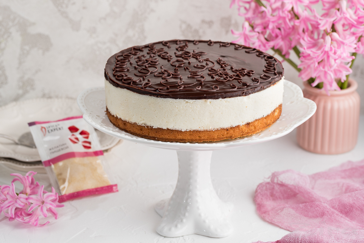 Збирати торт можна у формі для випікання. Ставимо на дно перший корж і виливаємо половину суфле на нього. Потім зверху – другий корж та ще одну частину суфле. Розрівнюємо силіконовою лопаткою та ставимо в холодильник приблизно на 2 години.