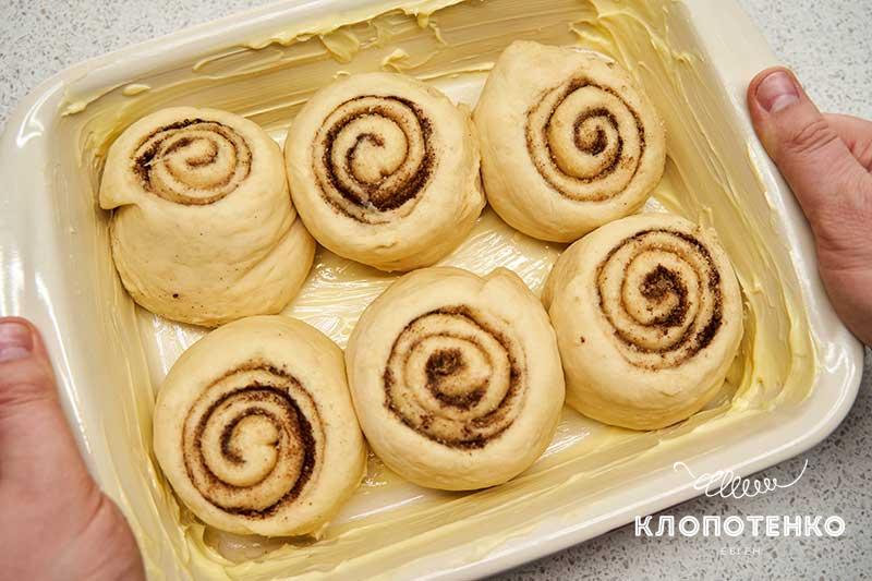 Змастіть вершковим маслом форму для запікання. Розкладіть синабони на відстані 1-2 см один від одного. Накрийте чистим рушником і залиште на 20-30 хвилин для вистоювання. У цей час увімкніть духовку розігріватися до 180 градусів. Коли синабони піднімуться, випікайте впродовж 30 хвилин.