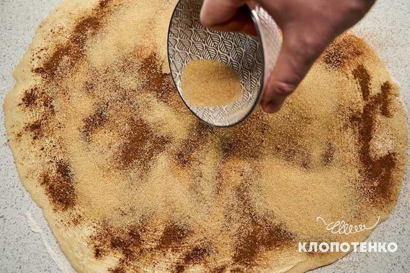 Рівномірно посипте усю поверхню тіста 1-2 ст. л. меленої кориці, а зверху так само рівномірно - 100-150 г коричневого цукру. Кількість кориці та цукру залежить від ваших вподобань щодо насиченості смаків.