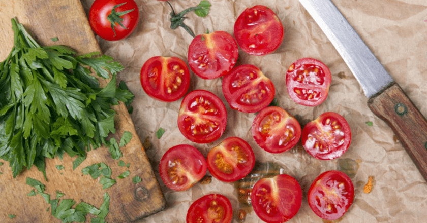 Якщо гості на порозі, і вам терміново потрібно порізати овочі на салат, наприклад, томати черрі, можна скористатися простим лайфхаком. Беремо дві однакові по діаметру тарілки або пластмасові кришки, викладаємо на одну томати, а другою накриваємо. Потім беремо ніж і, притримуючи верхню кришку, ріжемо їх.