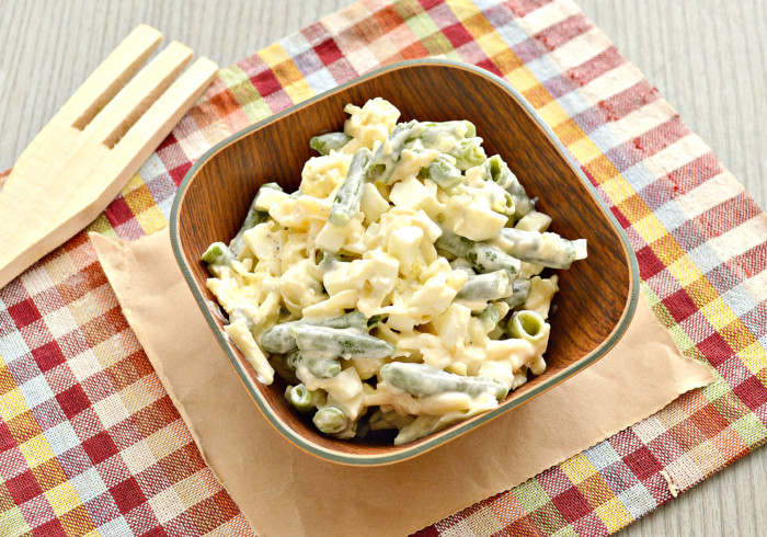 Інгредієнти: спаржева квасоля (500 г), яйця (5 шт.), цибуля (2 шт.), часник (2-3 зубчики), вершкове масло (1 ст. л.), сметана (1 ст. л.), гірчиця (1 ч. л.), лимонний сік (1 ч. л.), суміш перців, сіль, цукор (щіпка), сушений майоран (за бажанням).
