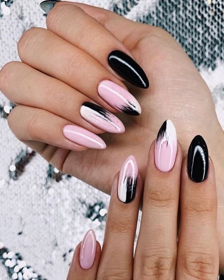 Для тих панянок, хто любить поєднувати світлі та темні відтінки, пропонуємо зробити нестандартний манікюр у рожевому, білому і чорному кольорах з імітацією недбалих мазків. З таким дизайном ви точно будете виділятися з натовпу.