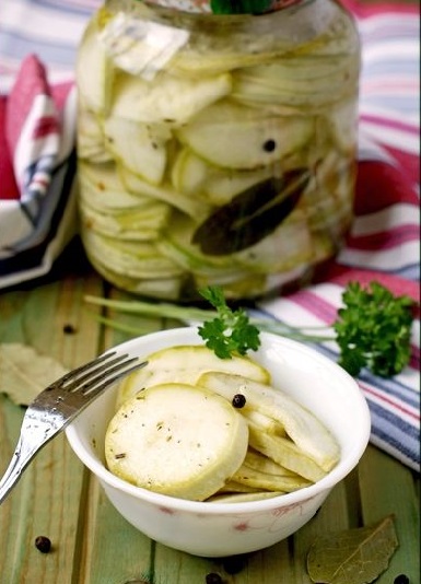 Інгредієнти: кабачки (1,8 кг), лист лавровий (3 шт.), кріп (1 пучок), часник (12 зубчиків), гвоздика (6 шт.), перець чорний горошком (2 ч. л.), вода (1,5 л), цукор (190 г), сіль (70 г), оцет 9% (190 мл).