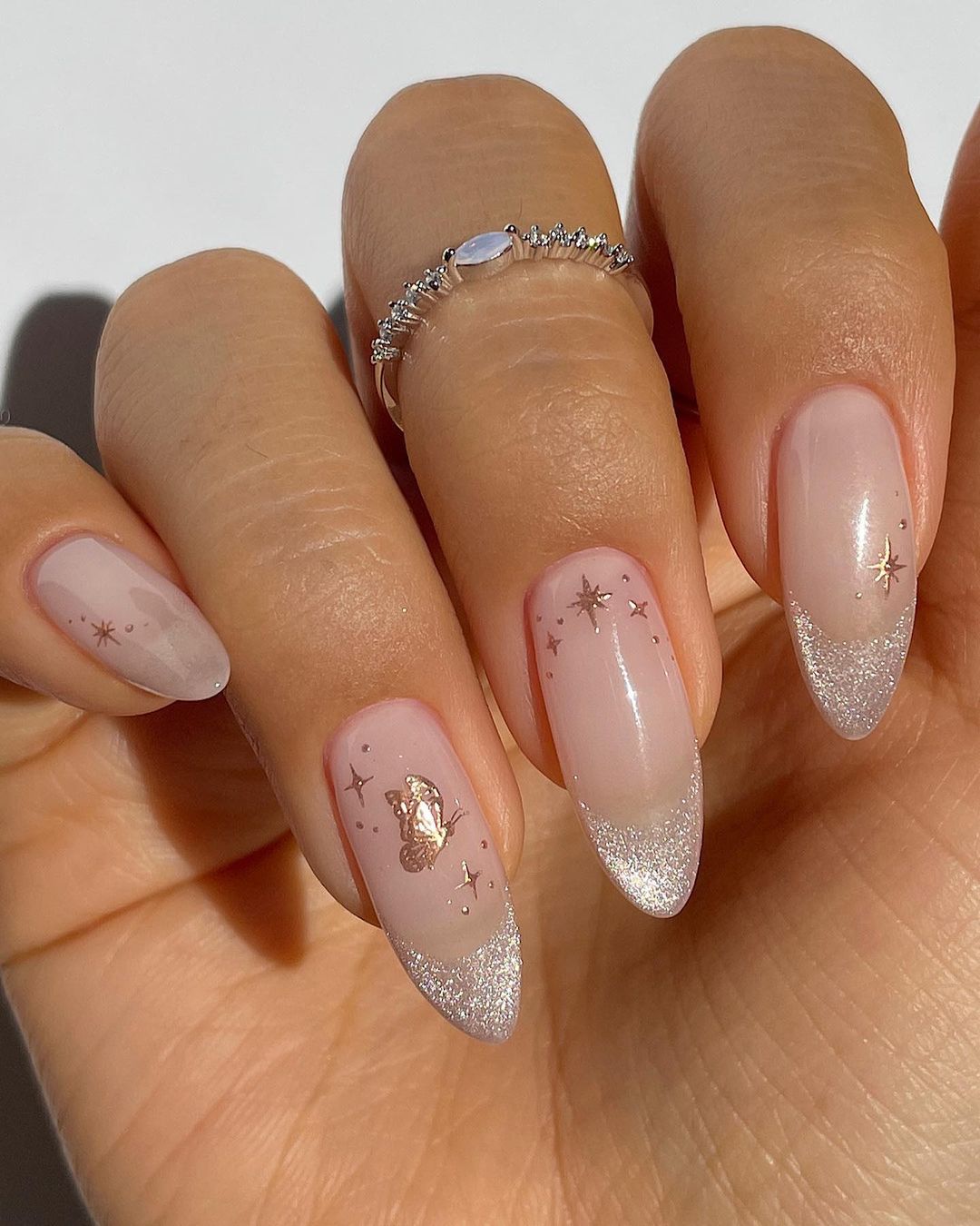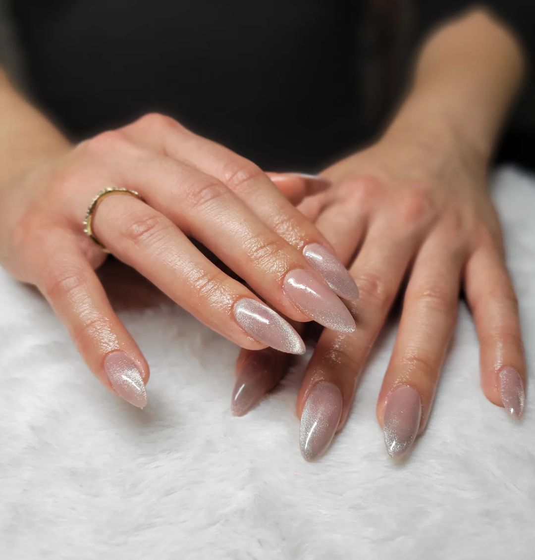 Особливість такого дизайну полягає в тому, що покриття виходить сяючим та переливається різними відтінками. Можна зробити його як в один тон, так і повторити актуальну зараз френч-ілюзію.