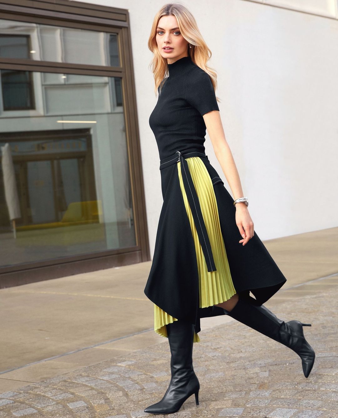 Високі чоботи-панчохи візуально подовжують ноги і бездоганно виглядають зі спідницями та сукнями. У тренді будуть як шкіряні ботфорти, так і текстильні, що облягають гомілку як друга шкіра.