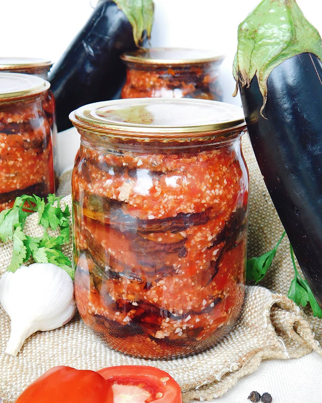 Інгредієнти: 6 кг баклажанів, 1 кг помідорів, 1 кг червоного болгарського перцю, 600 г часнику, 2-4 шт. гострого перцю чилі. Для маринаду: 400 г цукру, 400 г оцту, 400 мл олії, 3 ст. л. солі.