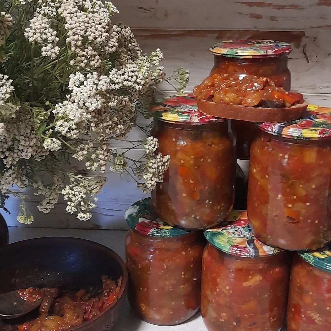 Інгредієнти: 2 кг баклажанів, 3 кг помідорів, 1,5 кг болгарського перцю, 2 стручки гострого перцю, 4 голівки часнику, 250 олії, 200 г цукру, 200 мл оцту 9%, 2 ст. л. солі (з гіркою).