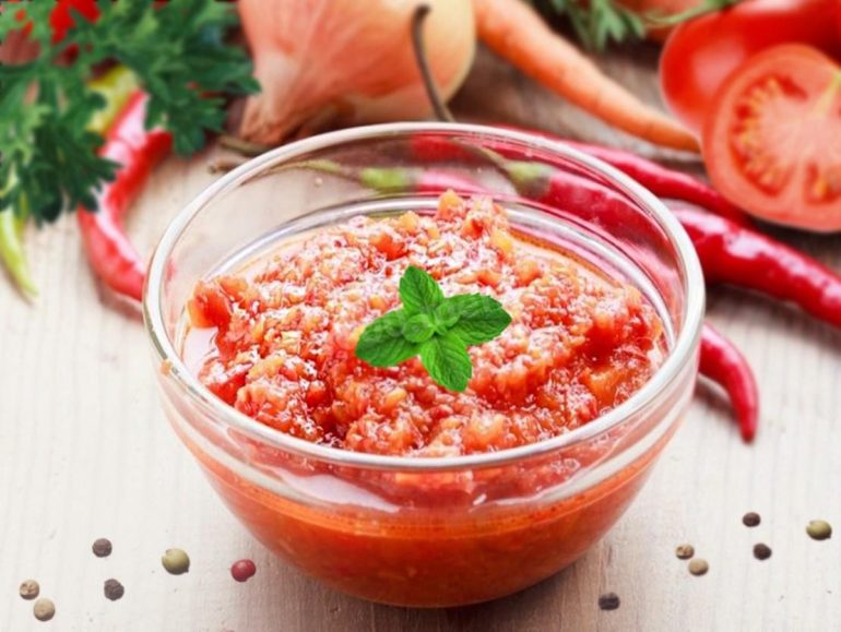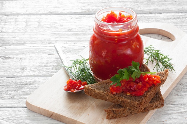 Інгредієнти: помідори (2,5 кг), перець болгарський (1,5 кг), гострий перець (7 шт.), часник (200 г), корінь хріну (100 г), сіль (2 ст. л.), цукор (1 ст. л.).
