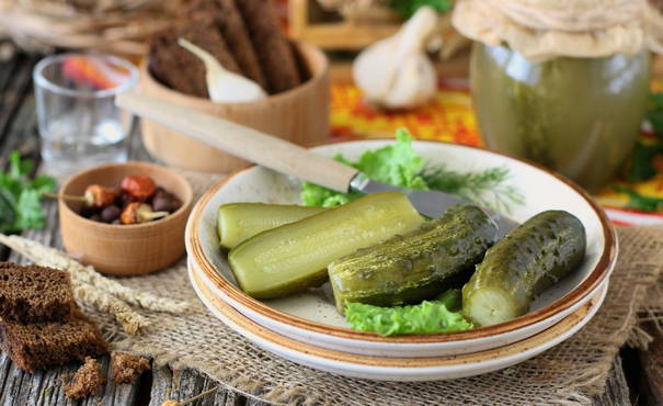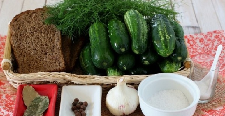 Інгредієнти: огірки (1 кг), часник (2-4 зубчики), житній хліб (3 скибочки), зелень (1 пучок), вода (1 л), сіль (1 ст. л.), цукор (0,5 ст. л.), запашний перець, лавровий лист.