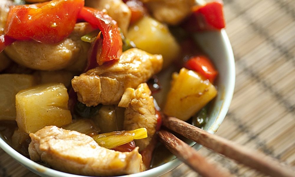 Наріжте перець, помідори та ананас невеликими шматочками, з'єднайте з соєвим соусом (4 ст. ложки) та томатною пастою, додайте цукор та воду. Тушкуйте на повільному вогні протягом 10 хвилин, після чого з'єднайте з куркою і готуйте ще 10 хвилин.