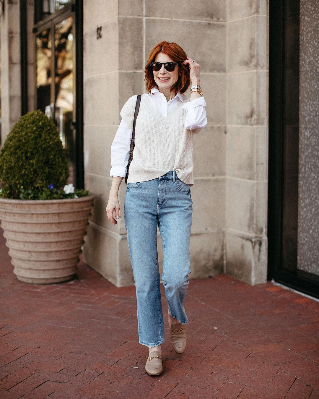 Цей модний фасон 2023 ідеально підходить жінкам за 50, створюючи сучасний і актуальний силует. З широкими джинсами стилісти рекомендую поєднувати більш обтислий верх, щоб збалансувати пропорції і підкреслити талію.