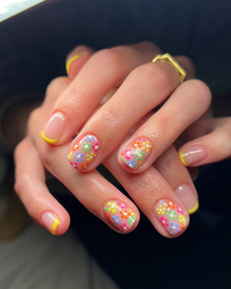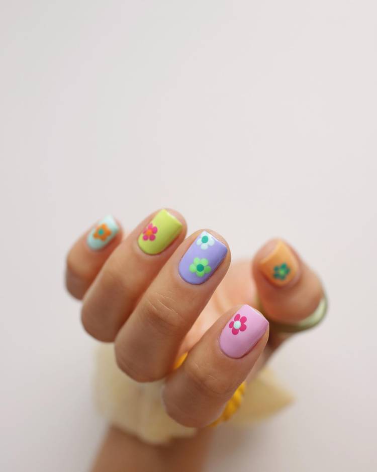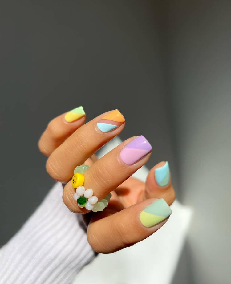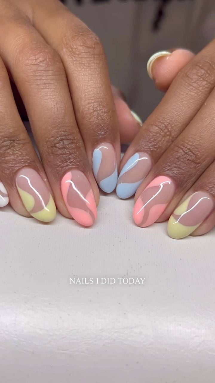 Дизайн насичених яскравих відтінків, зроблений на пастельній основі – це те, що дуже точно передає легкий весняний настрій. Таке покриття буде одночасно виглядати не нудно та витончено.