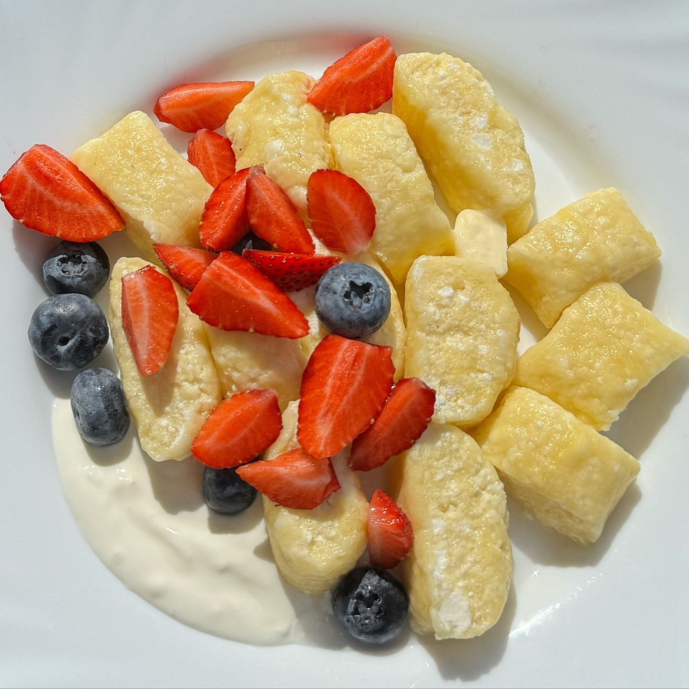 Подавати ліниві вареники можна з улюбленими фруктами і ягодами або ж із джемом, сметаною або згущеним молоком.