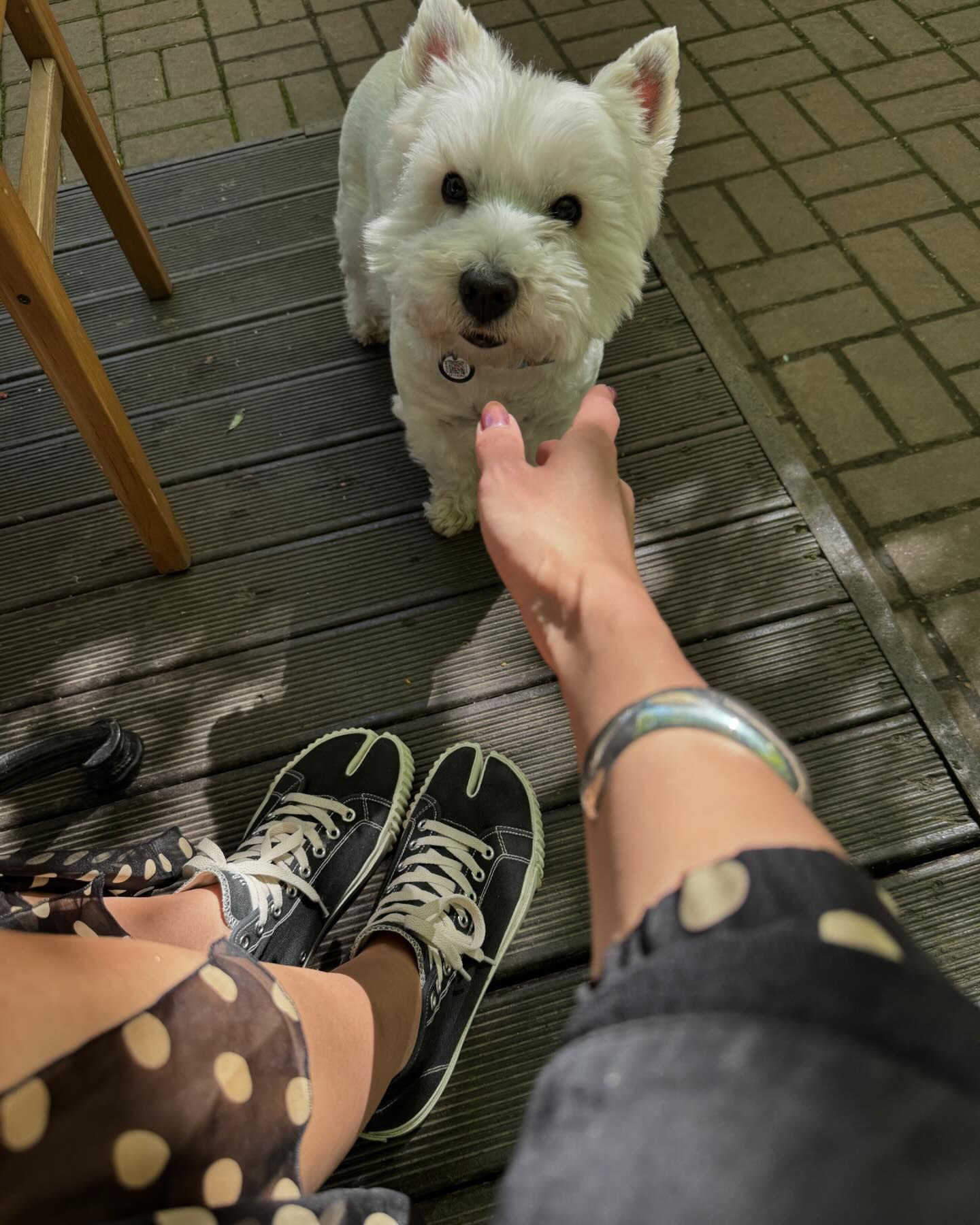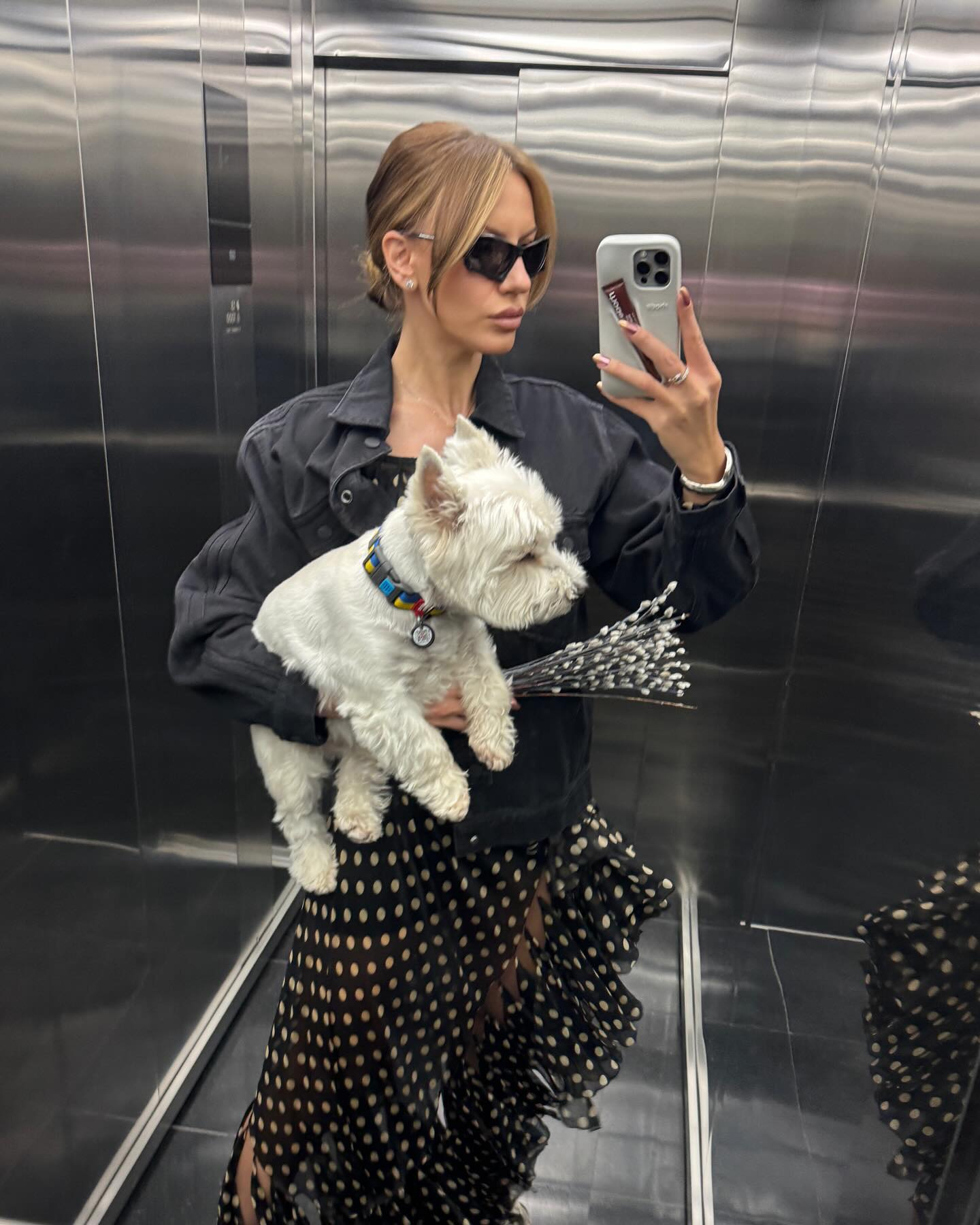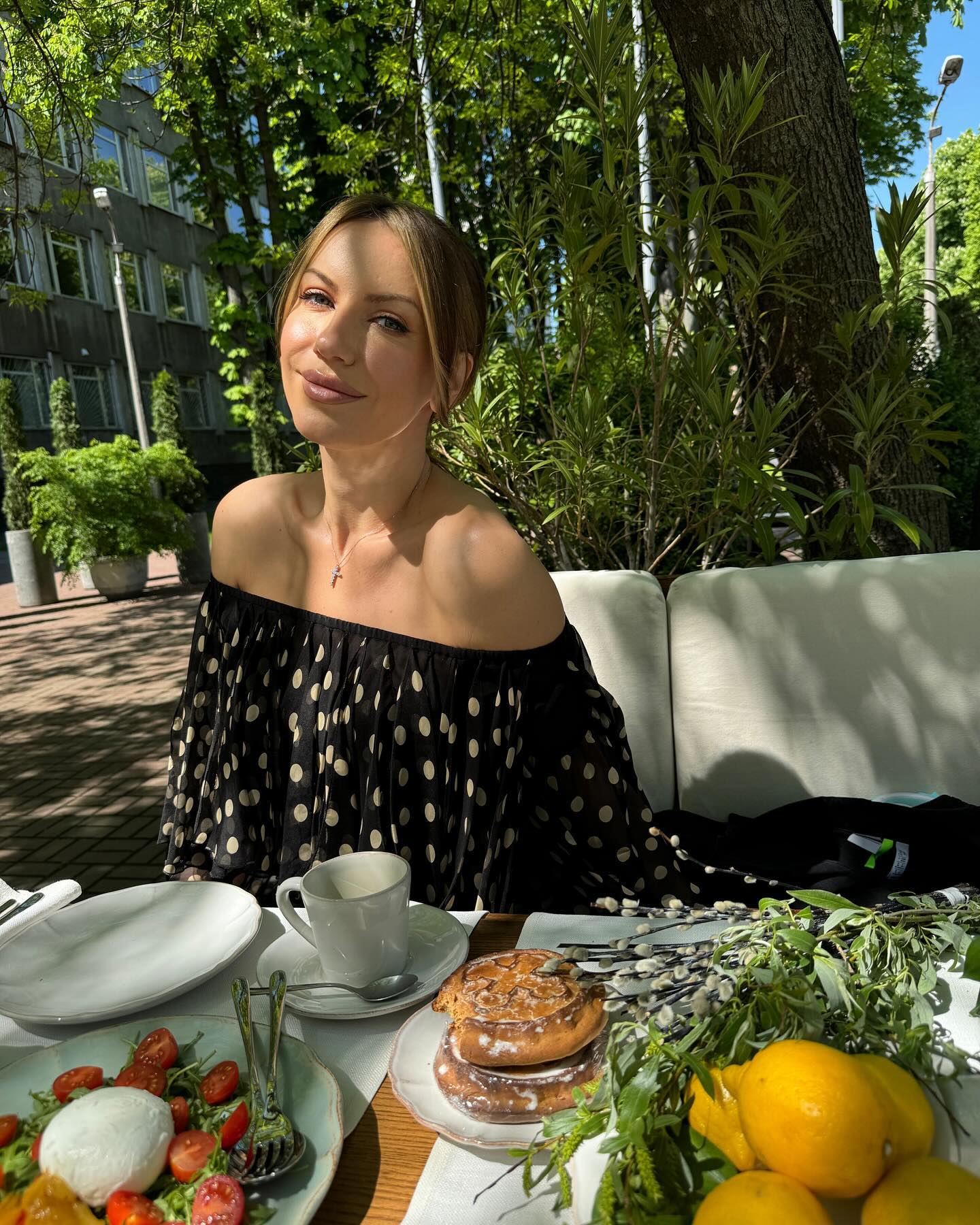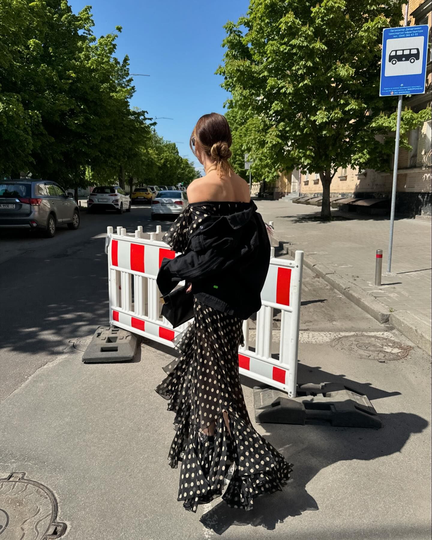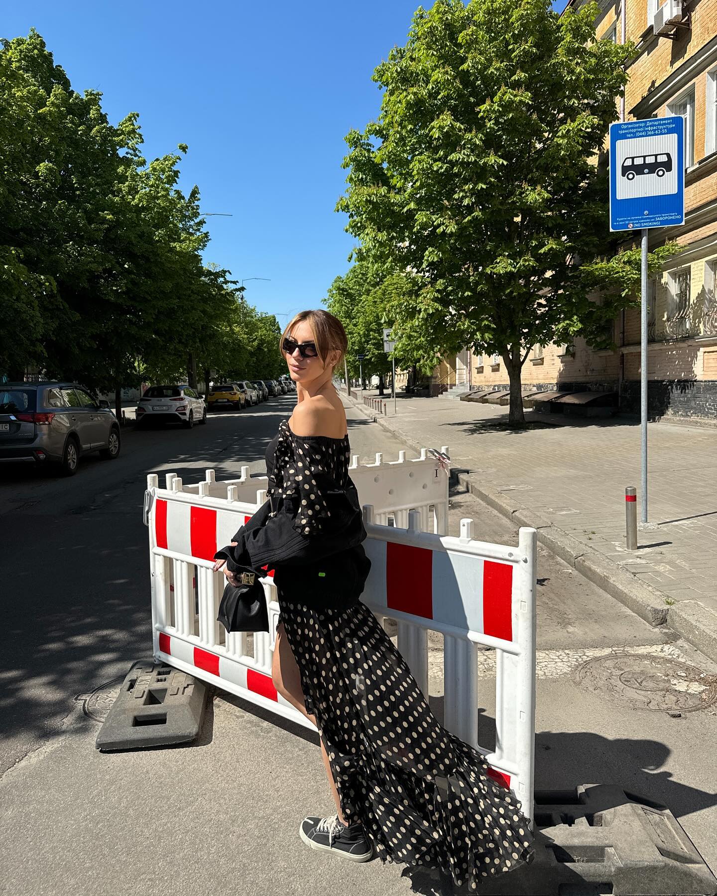 Нещодавно Леся Нікітюк опублікувала декілька знімків із прогулянки. Для розслабленого образу вона вибрала чорну сукню зі струмуючої тканини з принтом у горошок. Родзинка вбрання – спущені плечі, які зараз у тренді, а також великий розріз спереду та волани на спідниці.
