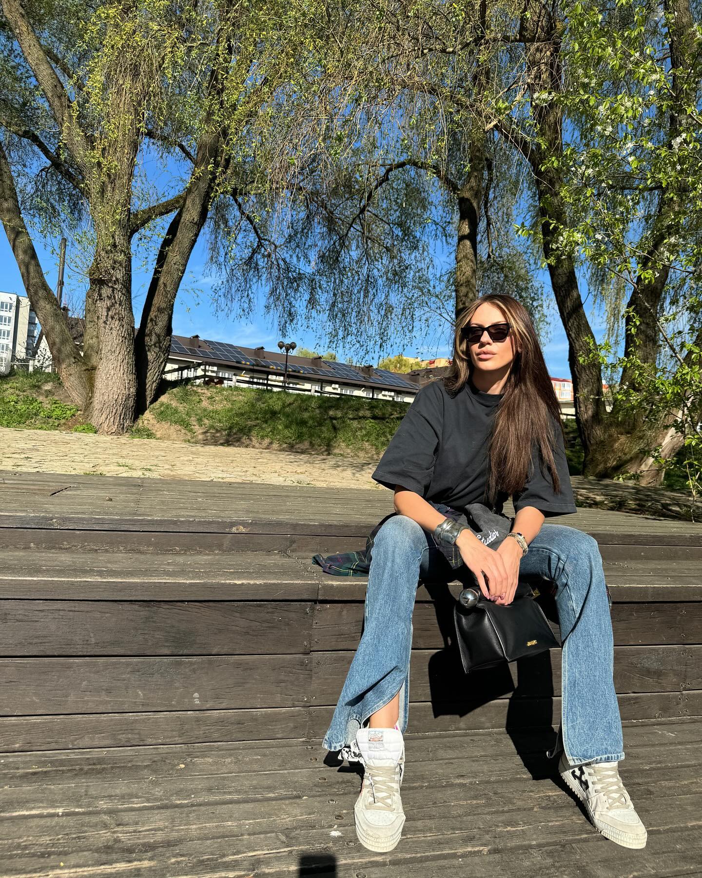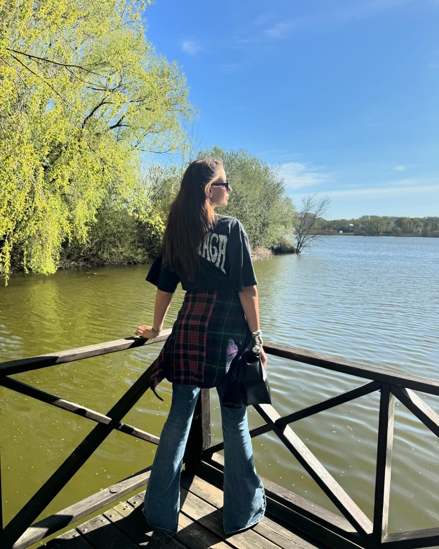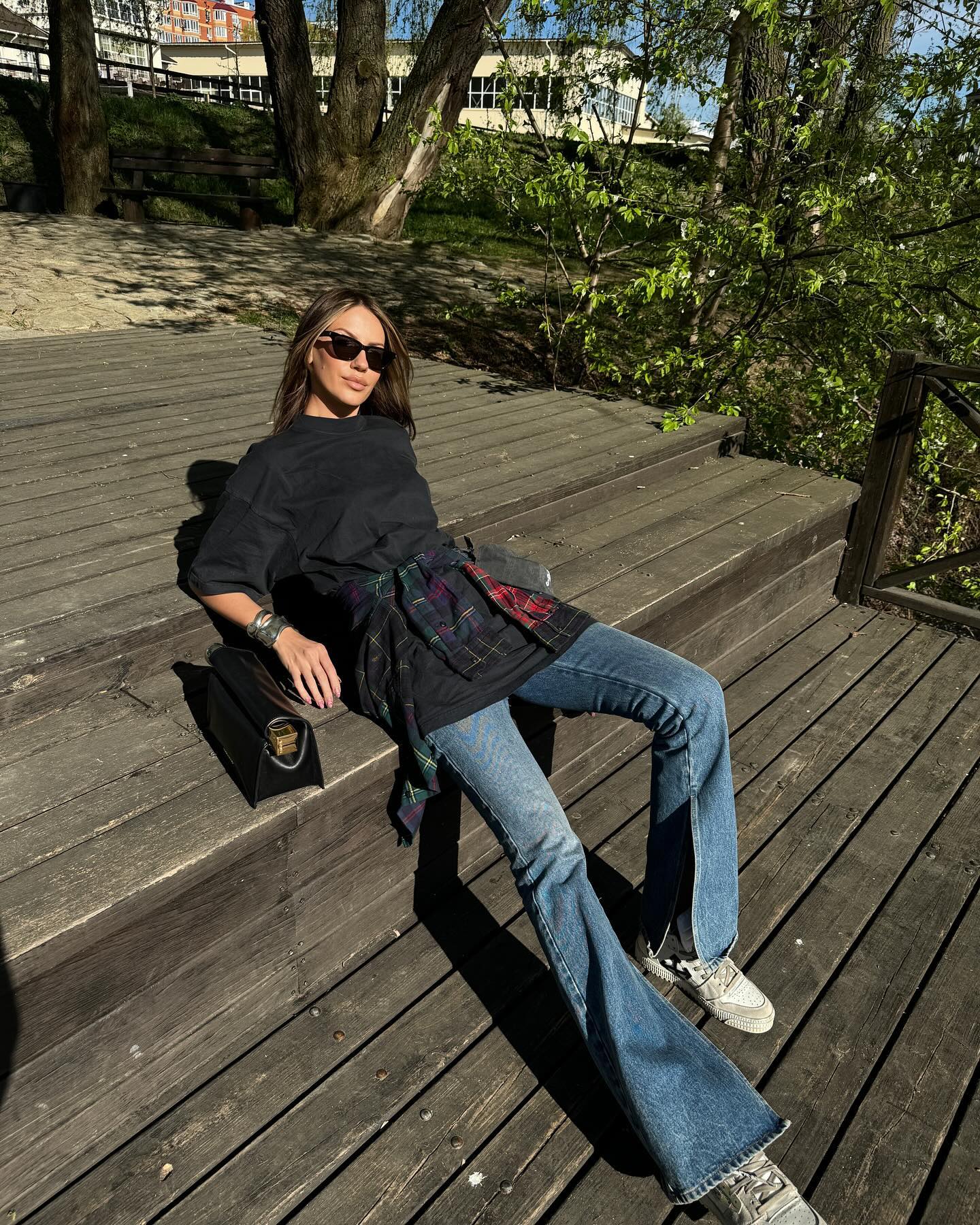 Днями Леся Нікітюк опублікувала декілька знімків зі свого рідного міста – Хмельницького. Для розслабленого луку вона вибрала блакитні джинси кльош, які розширюються від коліна до щиколотки, а також мають невеликі розрізи. Штани з деніму вона доповнила чорною футболкою оверсайз, а також картатою сорочкою, яку вона зав'язала на поясі. Завершували образ зручні кеди та сонцезахисні окуляри.