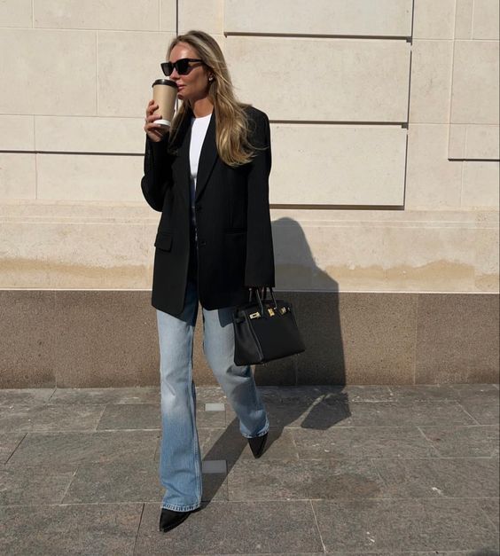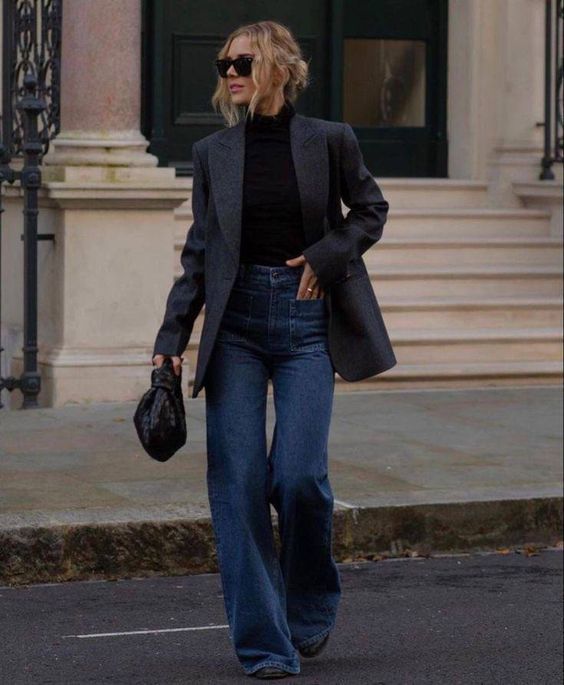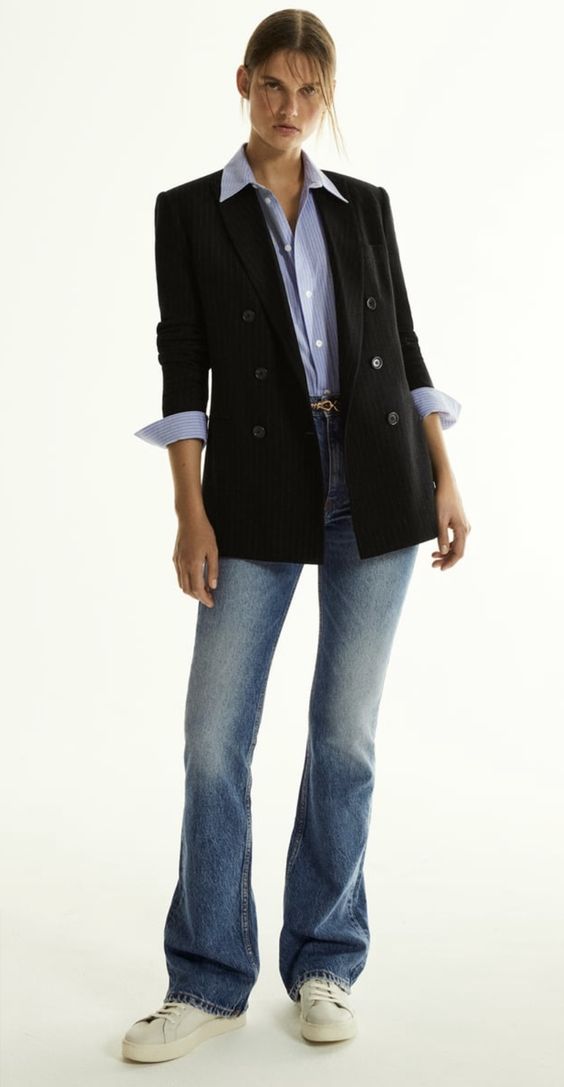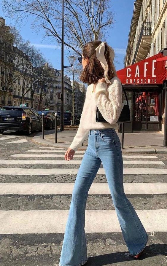 У 2024 році джинси кльош від коліна можна поєднувати як із взуттям на підборах, так і зі зручними кросівками. Доповнити їх можна топом, футболкою, лонгслівом або блузою, а зверху накинути жакет оверсайз або кардиган.